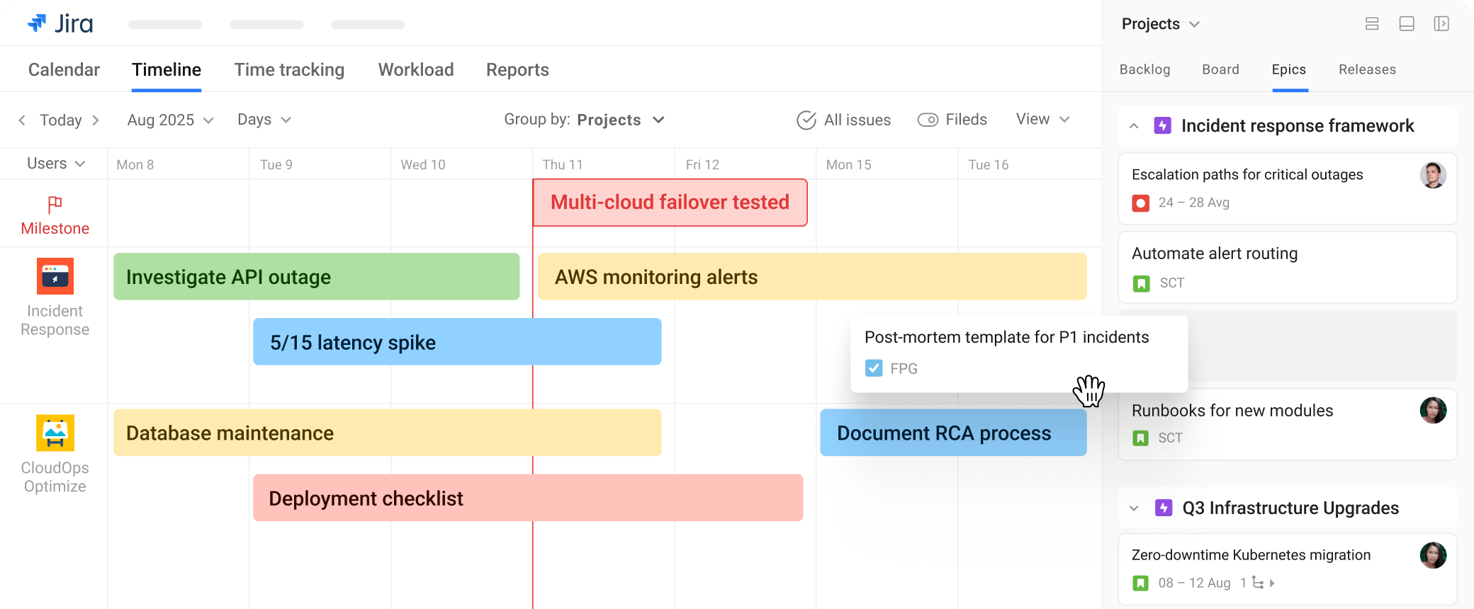 Planyway is a visual operations management software that enhances Jira for Operations with timeline planning, workload balancing, and real-time reporting—perfect for IT, DevOps, and security operations teams**.**