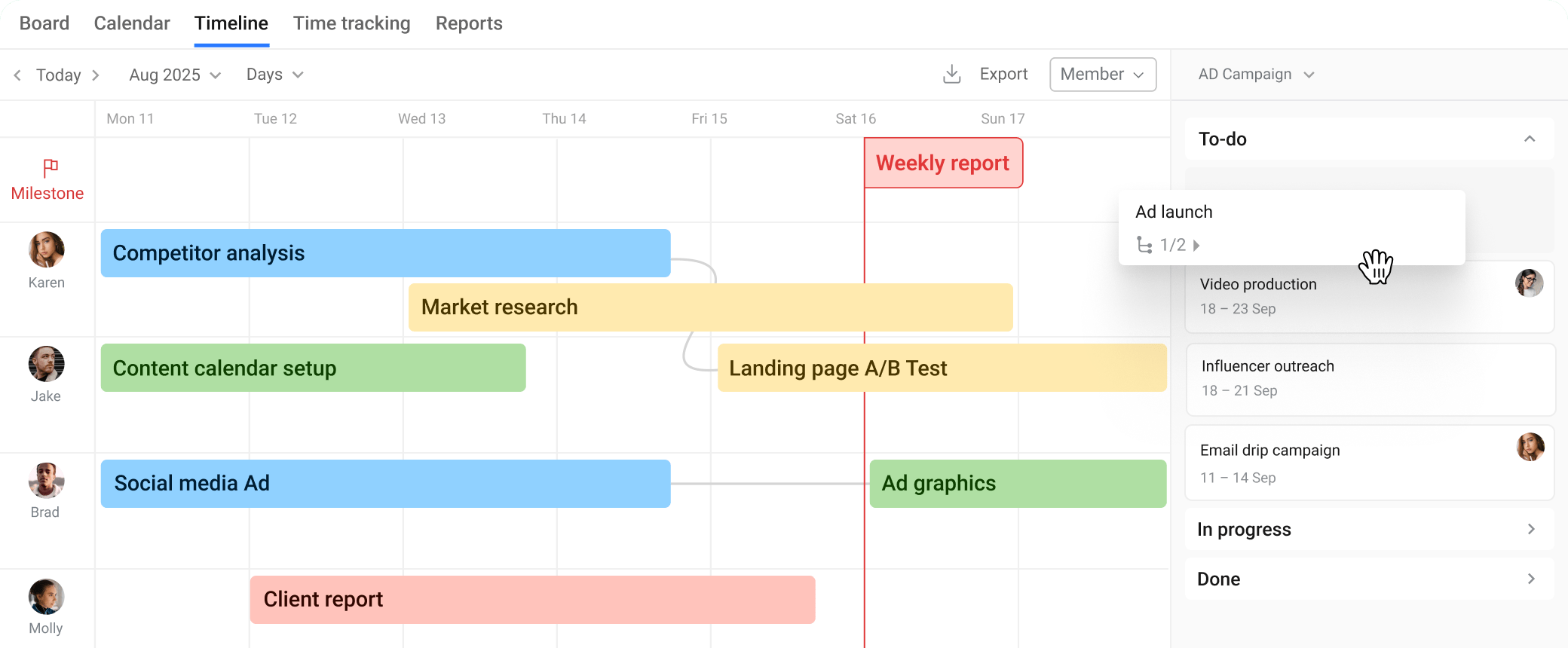 Planyway adds the structure needed to execute complex campaigns. For any Trello marketing strategy template, you can use Planyway's dependencies to ensure tasks happen in the right order (e.g., the landing page must be live before the trello email marketing campaign launches). You can also use subtasks and checklists to break down big goals into manageable steps, all visually mapped on the timeline for clarity.